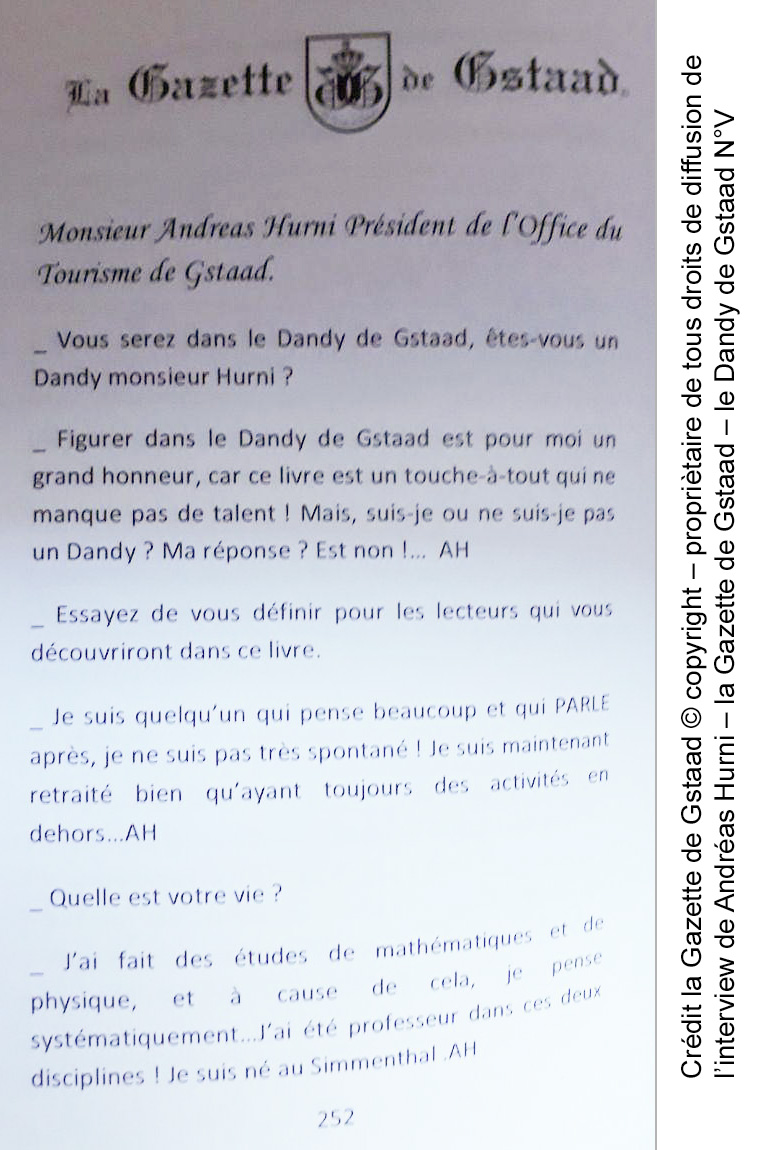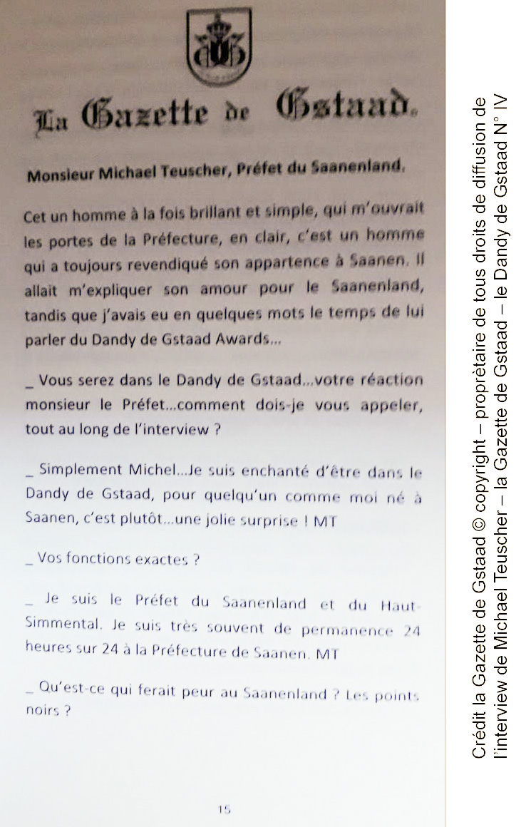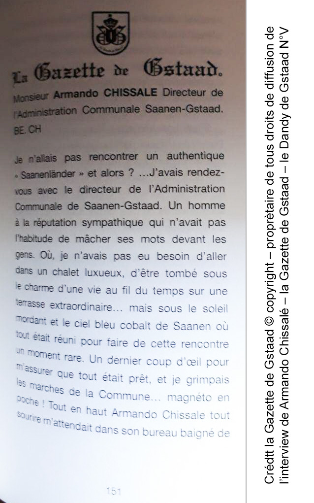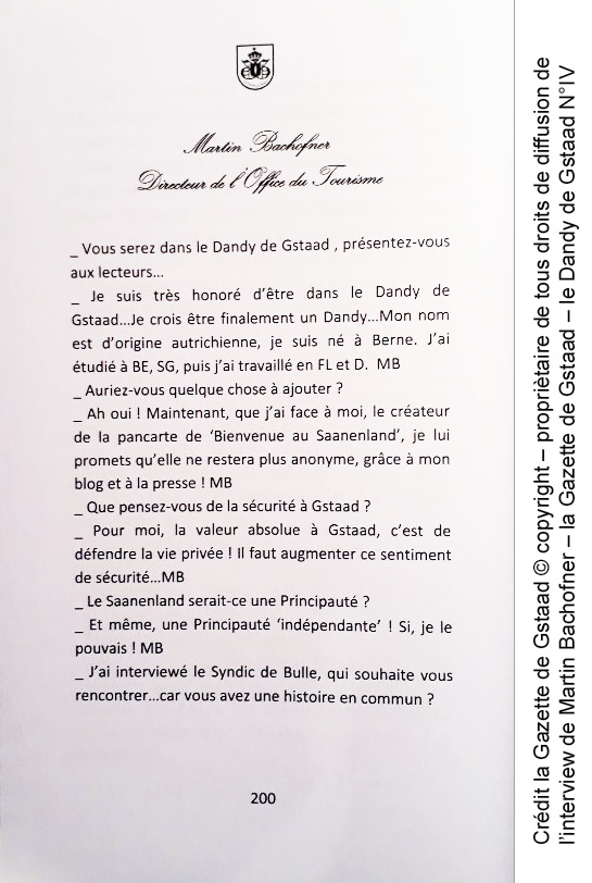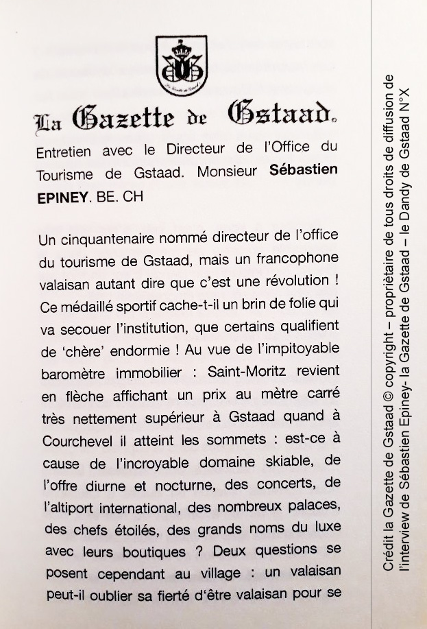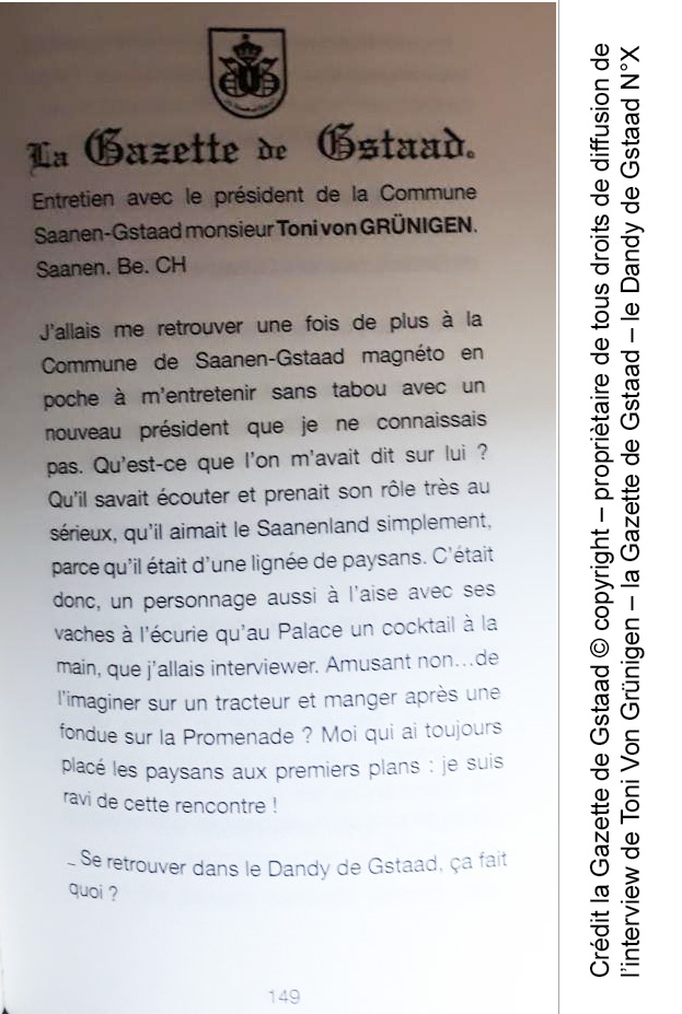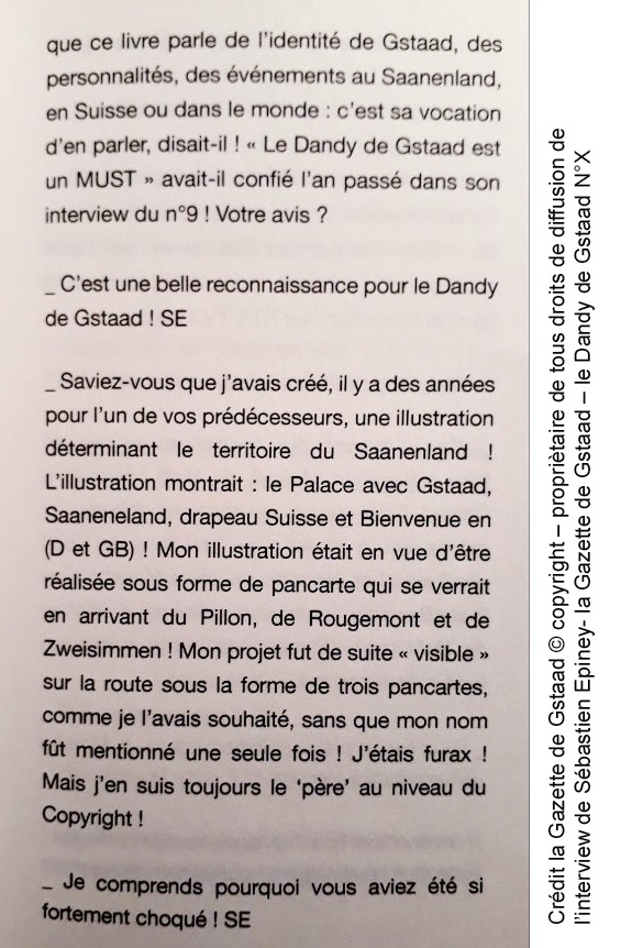A mentionner qu’à chaque interview, l'auteur se présente, en tant qu’auteur du ‘ Dandy de Gstaad ‘ Fondateur de la ‘ Gazette de Gstaad ‘ de ‘ Gstaad Editions ‘ Créateur de la pancarte de ‘ Bienvenue au Saaneland ‘ et Illustrateur.
