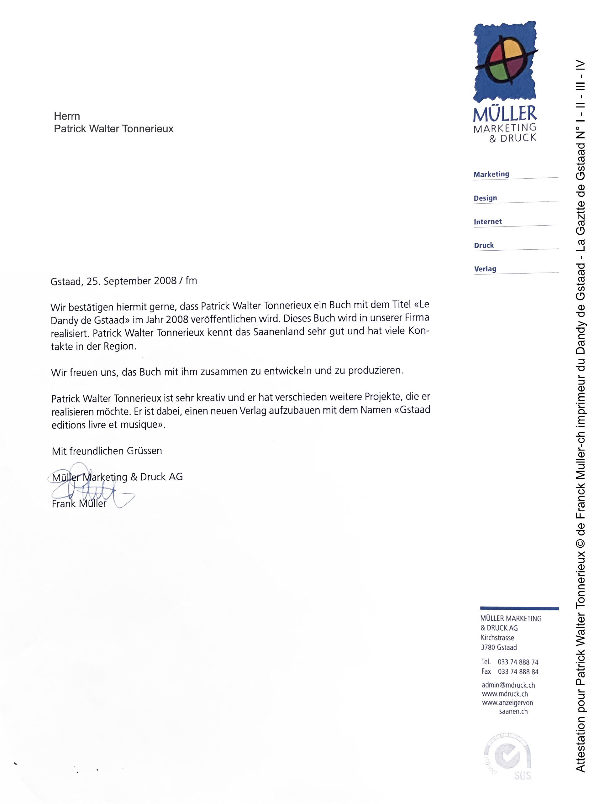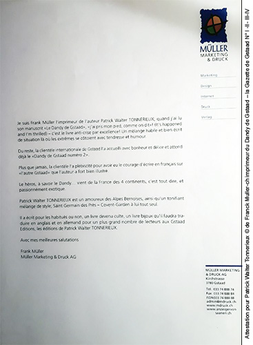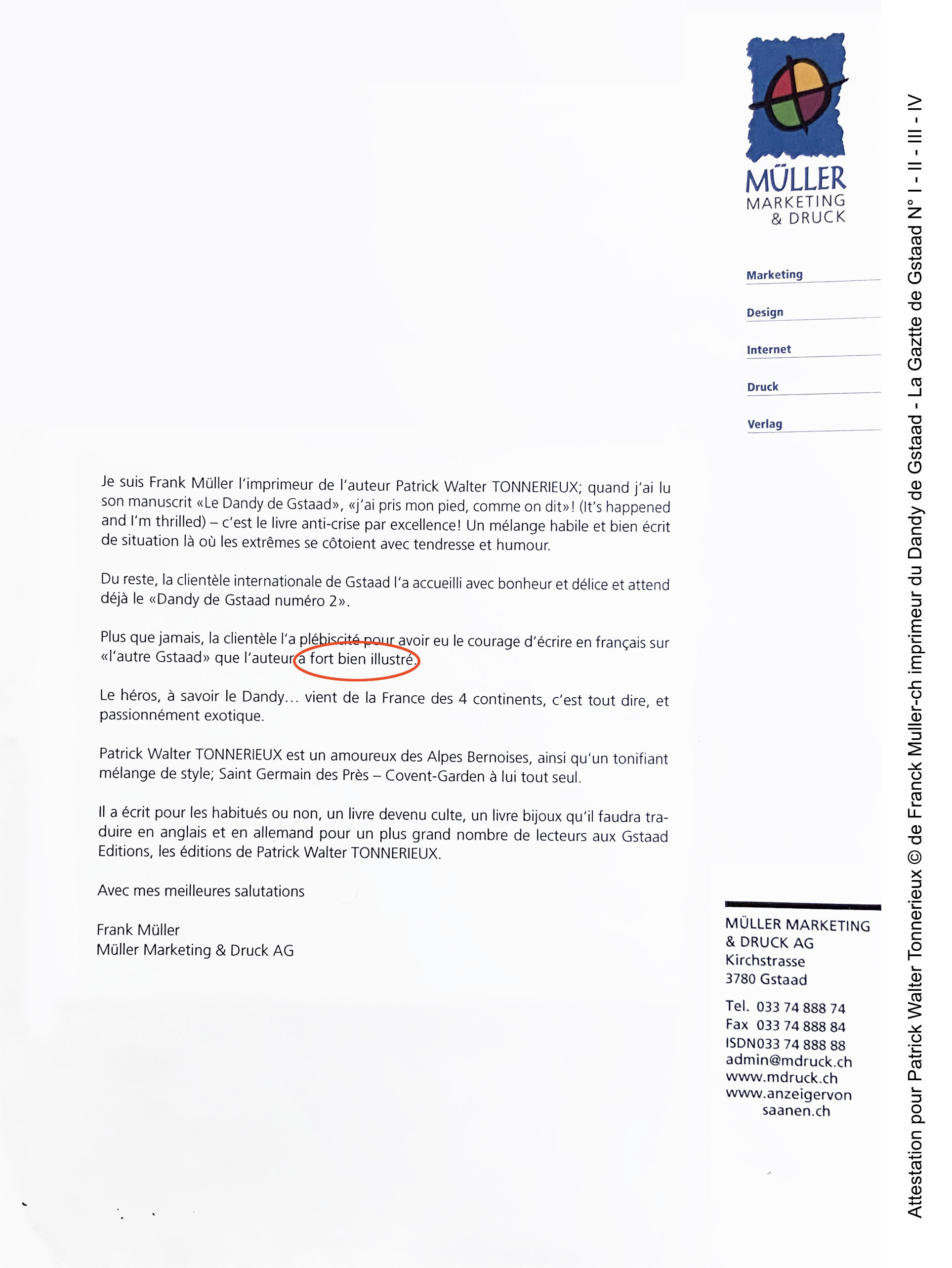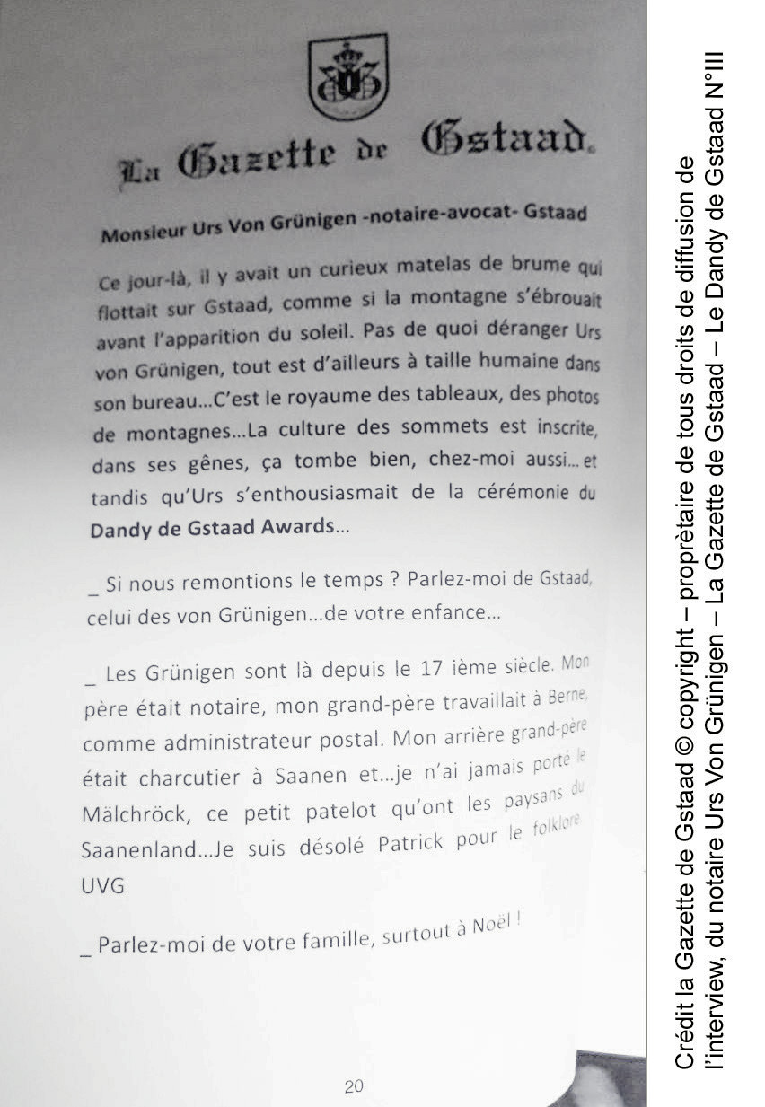 A mentionner qu’à chaque interview, l'auteur se présente, en tant qu’auteur du ‘ Dandy de Gstaad ‘ Fondateur de la ‘ Gazette de Gstaad ‘ de ‘ Gstaad Editions ‘ Créateur de la pancarte de ‘ Bienvenue au Saaneland ‘ et Illustrateur.