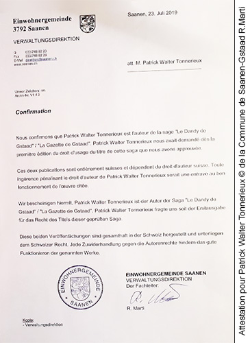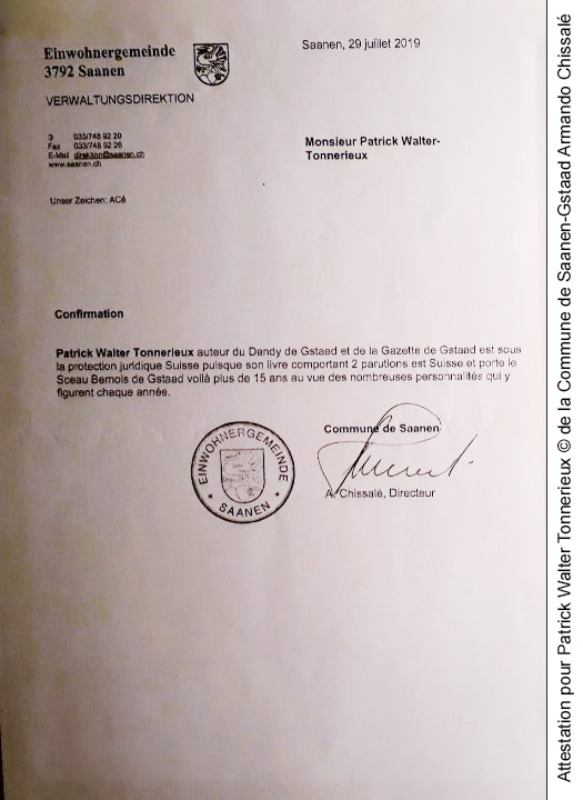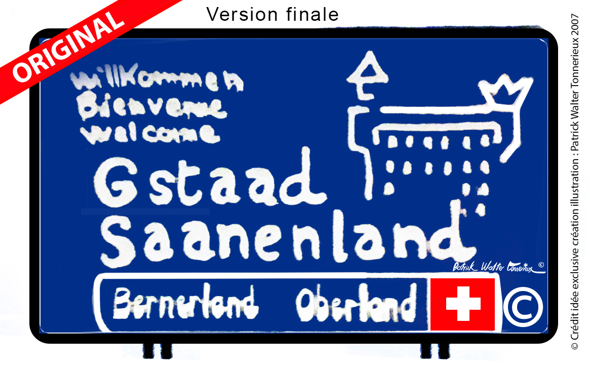Patrick Walter Tonnerieux a toujours été parfaitement clair et transparent sur sa création. Avertir des personnalités politiques et des juges cantonaux a été chose facile pour l’auteur qui a récolté nombres d’attestations pour sa pancarte que tous connaissent depuis des années. Interpeller les plus hautes instances, afin de mettre en lumière le Palais Fédéral et la Cour de Justice Européenne, ainsi que les Institutions pour la Défense du droit d’auteur. C’est ce que l’auteur a fait , afin de savoir qui d’autres que lui aurait créé cette pancarte, aucun nom n’a jamais été dévoilé, de même qui est responsable et impliqué dans la pose des panneaux routiers.Tout ceci, pour savoir dans quelle mesure, les autorités Suisses sont au courant de la violation de ce droit d’auteur. A mentionner qu’on donnait à l’auteur une indemnisation de 1000CHF, somme fantaisiste qui représente néanmoins une certaine reconnaissance de paternité de l’oeuvre, qui peut être interprété comme une forme d’aveu de bien-fondé. Sans chiffrer le nombre d’années d’utilisation sur les routes de la pancarte, devenue la ‘carte de visite de Gstaad’ Cette dernière a une valeur juridique et n’est pas qu’un symbole signé Patrick Walter Tonnerieux mais, la conjugaison d’une idée et d’un graphisme, avec une tour portant sur la droite, un W, pour Walter. Sous copyright de l’auteur cette pancarte de ‘ BIENVENUE AU SAANENLAND’ reste et demeure. On l’a retrouve dans ‘LE DANDY DE GSTAAD’ et dans le coeur des personnalités interviewées dans ‘LA GAZETTE DE GSTAAD ©’.