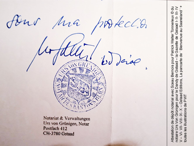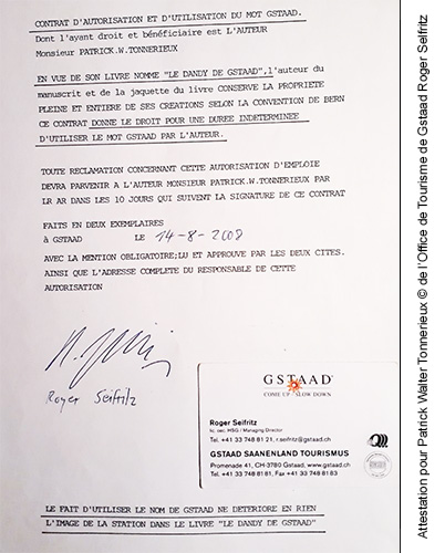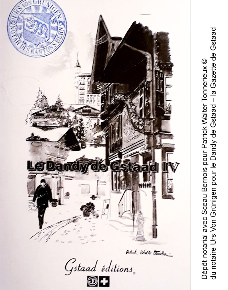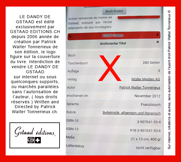 LE DANDY DE GSTAAD est édité exclusivement par GSTAAD EDITIONS.CH depuis 2006 année de création par Patrick Walter Tonnerieux de son édition, le logo figure sur la couverture du livre. Interdiction de vendre LE DANDY DE GSTAAD sur internet ou sous quelconques supports, ou marchés paralléles sans l’autorisation de l’auteur, ( tous droits réservés ) Written and Directed by Patrick Walter Tonnerieux.ch.