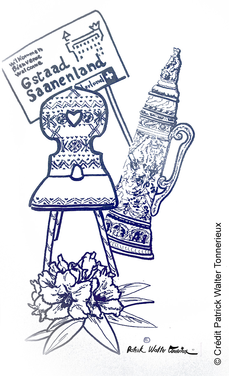 _Les personnages du ‘Dandy de Gstaad’ sont des aristocrates originaux et extravagants, de nobles exilés fiscaux à Gstaad d’une simplicité sublime qui appelaient le village par son véritable nom historique Gessenay ou Gesse en prenant l’air précieux et unique, comme pour dérouter encore plus les ‘pics-bœufs’©. PWT