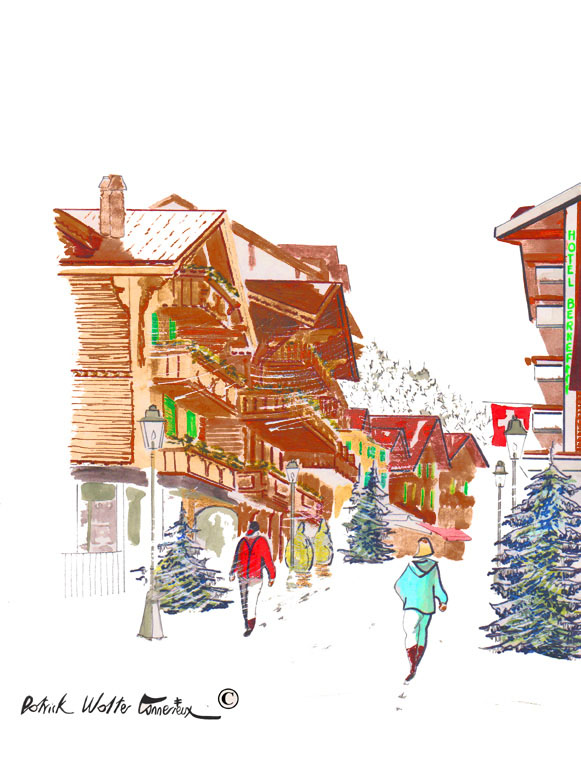 _ C’est un gros village, mais pas une ville à la montagne, ça m’agace ! Gstaad, c’est la Promenade…ce long ruban de velours que j’aime en terrasse ou sur un banc, j’y prends beaucoup de notes, les gens m’inspirent et parfois même je les croque sur le vif. Certains semblent heureux, d’autres semblent damnés, entre eux une rivalité grandit ; ils s’accusent mutuellement par des sourires d’éternels adolescents, puis noient ensuite leurs désillusions dans l’alcool. PWT
